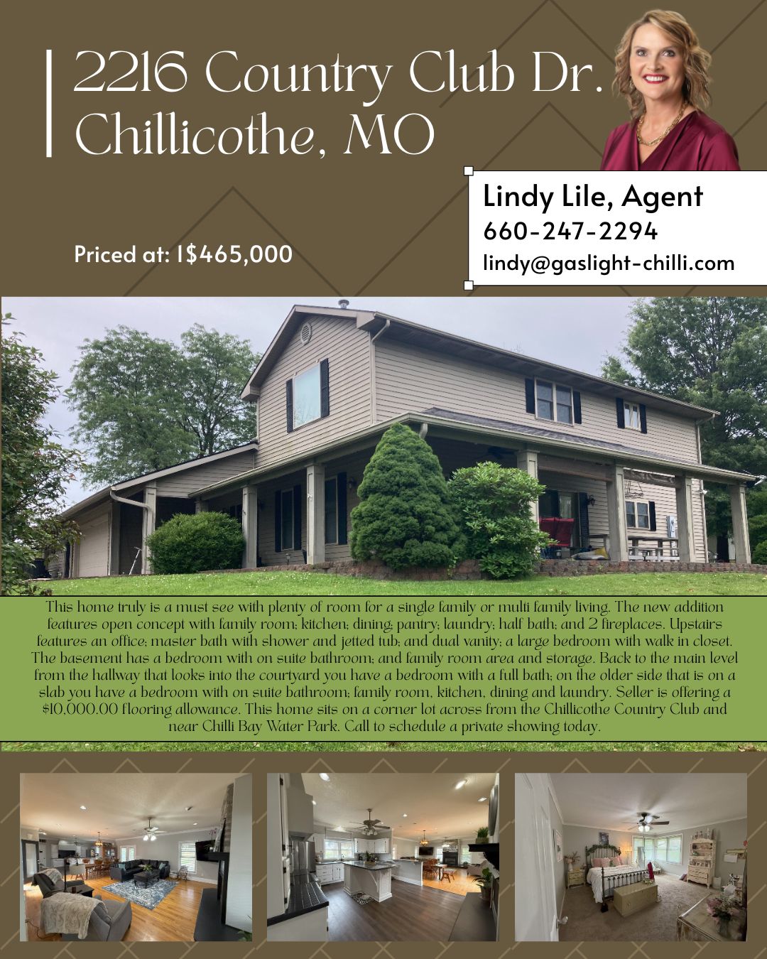 This home truly is a must see with plenty of room for a single family or multi family living. The new addition features open concept with family room; kitchen; dining; pantry; laundry; half bath; and 2 fireplaces. Upstairs features an office; master bath with shower and jetted tub; and dual vanity; a large bedroom with walk in closet. The basement has a bedroom with on suite bathroom; and family room area and storage. Back to the main level from the hallway that looks into the courtyard you have a bedroom with a full bath; on the older side that is on a slab you have a bedroom with on suite bathroom; family room, kitchen, dining and laundry. Seller is offering a $10,000.00 flooring allowance. This home sits on a corner lot across from the Chillicothe Country Club and near Chilli Bay Water Park. Call to schedule a private showing today.